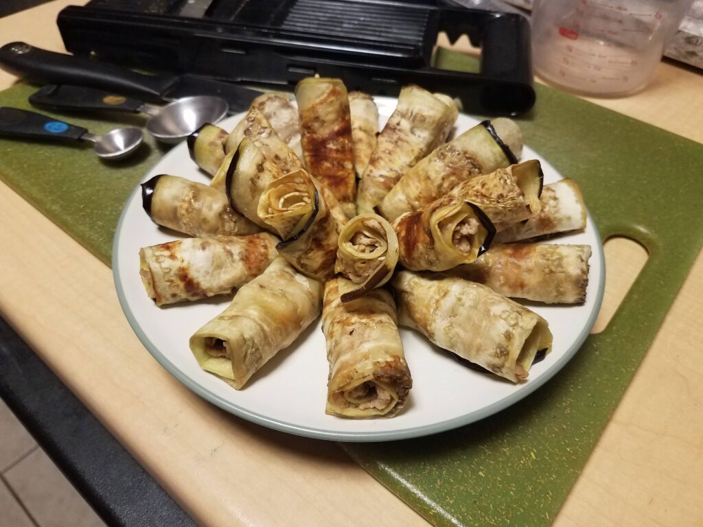 Fry eggplant slices in a pan with just enough oil to ensure browning on each side (3-5 minutes over medium heat). Transfer to a cooling rack lined with paper towels. Once each piece is cool, spread a tablespoon of filling on each piece (photos and videos indicate a lot more than one tablespoon) and roll up. Garnish with pomegranate seeds, assuming they’re in season.