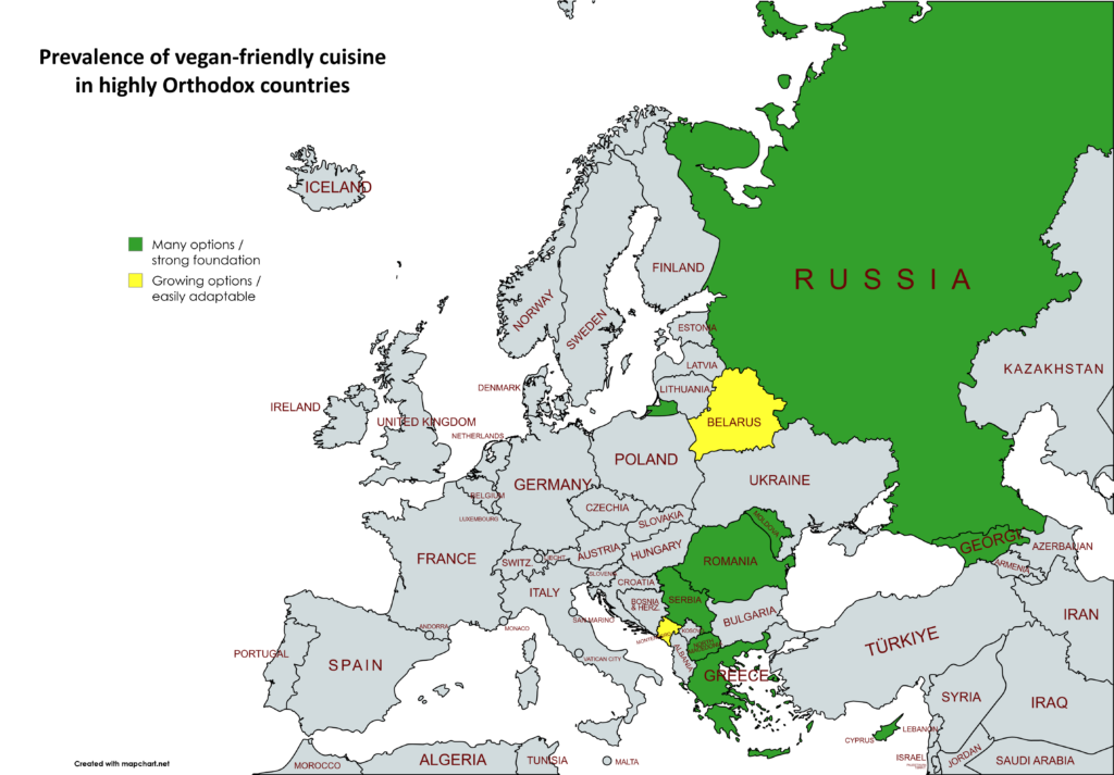 Consequently, for the purposes of this post, we’ll be looking at food from Türkiye’s neighbor Georgia, which is in the top five predominantly Eastern Orthodox countries in the world, with 83% of its people identifying as such. Georgia is considered Eastern European, a category of cuisine I always believed to be heavy in animal products (and it is). While that is the case, there are also many vegan, vegan-friendly, or vegan-adaptable options for fasting, plus a healthy familiarity with a range of spices, given its location between Eastern Europe and Western Asia. Georgian cuisine features vegetable patties, nut-stuffed eggplant, bean stews, and mushroom dumplings, all of which sounded delicious to me. [18] Sadly, there aren’t many options for restaurants around Pittsburgh, but I found a few in Philly to try out on a future trip back east. For the time being, however, I have the internet and my kitchen.