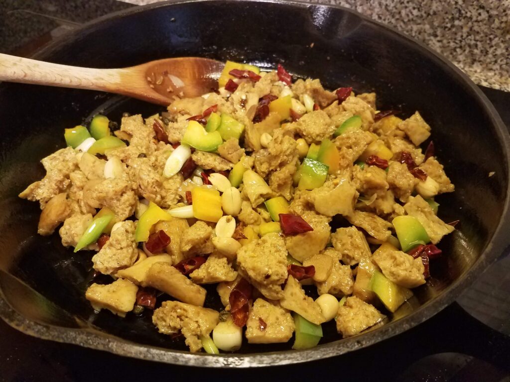 Ideally use a wok (or a well-seasoned cast iron skillet [20] if you have an induction cooktop). Heat the pan over medium-low and transfer about 2 Tbs of the frying oil (you may need more oil and sauce if you’re not using a wok, since they’ll spread out more on a flat surface – just keep an eye on it). Add the ginger and garlic, stir for one minute; add the pepper and chilis, stir until fragrant but make sure not to burn them; add the tofu and stir for one minute; add the stir fry sauce, scallions, green pepper/chilies, peanuts, and sesame seeds; stir to coat and continue cooking until moisture is largely evaporated. Veggies should still be crisp, tofu should still be tender, but there should not be a wet sauce that spreads on the serving dish.