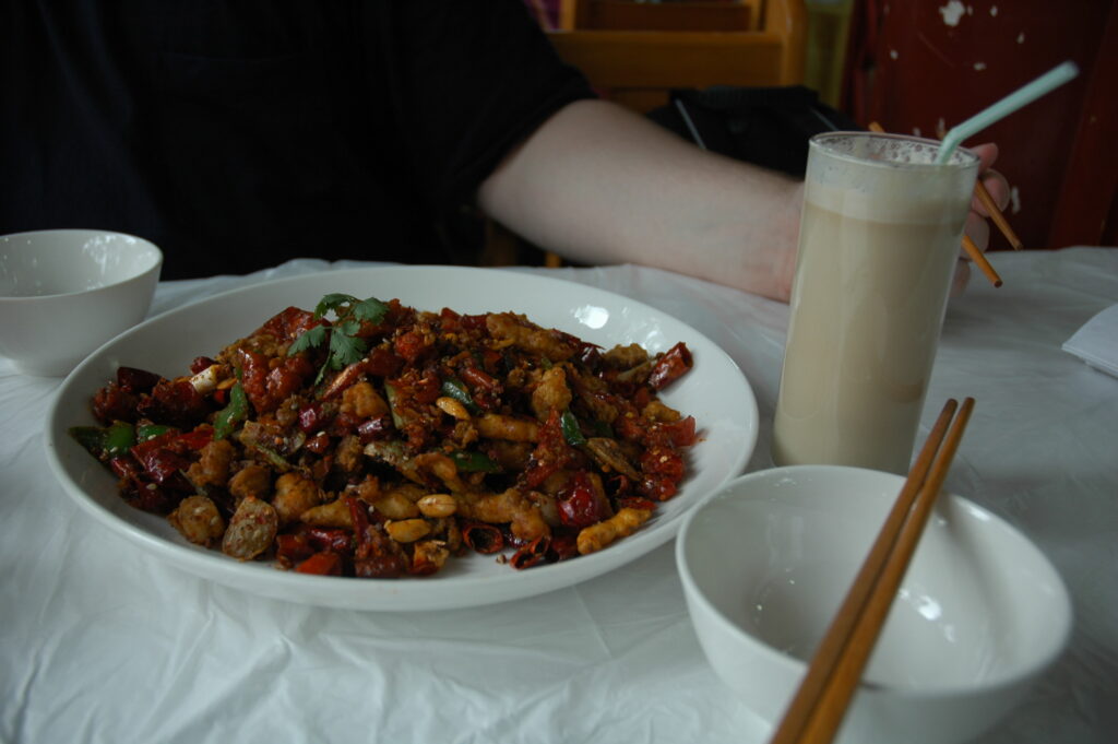 I’ve done enough Italian and Indian cooking in recent years to know that there is rarely a “definitive” recipe for any dish, and I’ve given myself permission to experiment a little with what I have on hand or what I want to taste. My goal with this recipe was to recreate a dish Arthur and I ate that day, called “spicy, fried entrails.” I had that caption on photo of it and a vague recollection that it was something like Chongqing chicken (but not exactly) or a westernized version of kung pao chicken (but if they were doing that for the benefit of tourists, the dish did not carry that name). Consequently, I’ve cobbled together aspects of a few different recipes [15], [16], [17] to create something that is pretty close to what we had and does a decent job of imitating offal with readily-available ingredients.