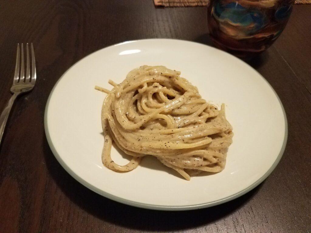It has been a while since I’ve made cacio e pepe because it has always been a bit of a pain. I will say that this batch was made far easier by grinding the pepper in a coffee grinder instead of by hand and by mixing the cheese in an upright blender instead of grating it all with a microplane. I attempted to use an immersion blender, as was instructed in the journal article, and wound up with chunky sauce both in the pan and around my kitchen; I will definitely use the upright blender in the future.