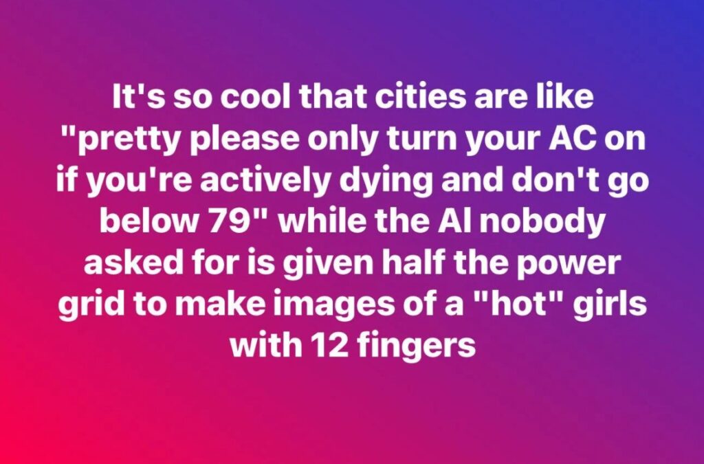 I fundamentally agree with him, even though I don’t want to. I don’t like the incessant push for optimization of our lives, the idea that “more” and “faster” equate to “better.” I firmly believe that in order for us to retain qualities that are uniquely human, we need to nurture them – ideally slowly, quietly, and away from screens. [7] That said, I do recognize that it probably behooves us to understand what technology is available to us and how it works so we can more effectively choose when to use it (and when not to). And I would be more willing to do that if not for some of the looming negative impacts to the world at large that we can expect to see in the wake of the AI buildout.